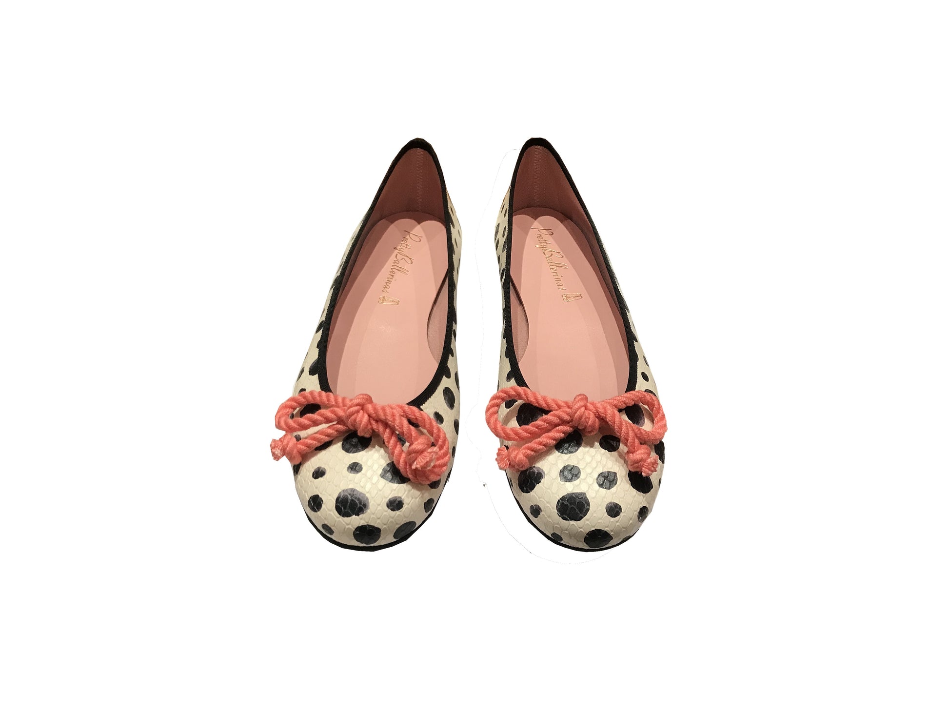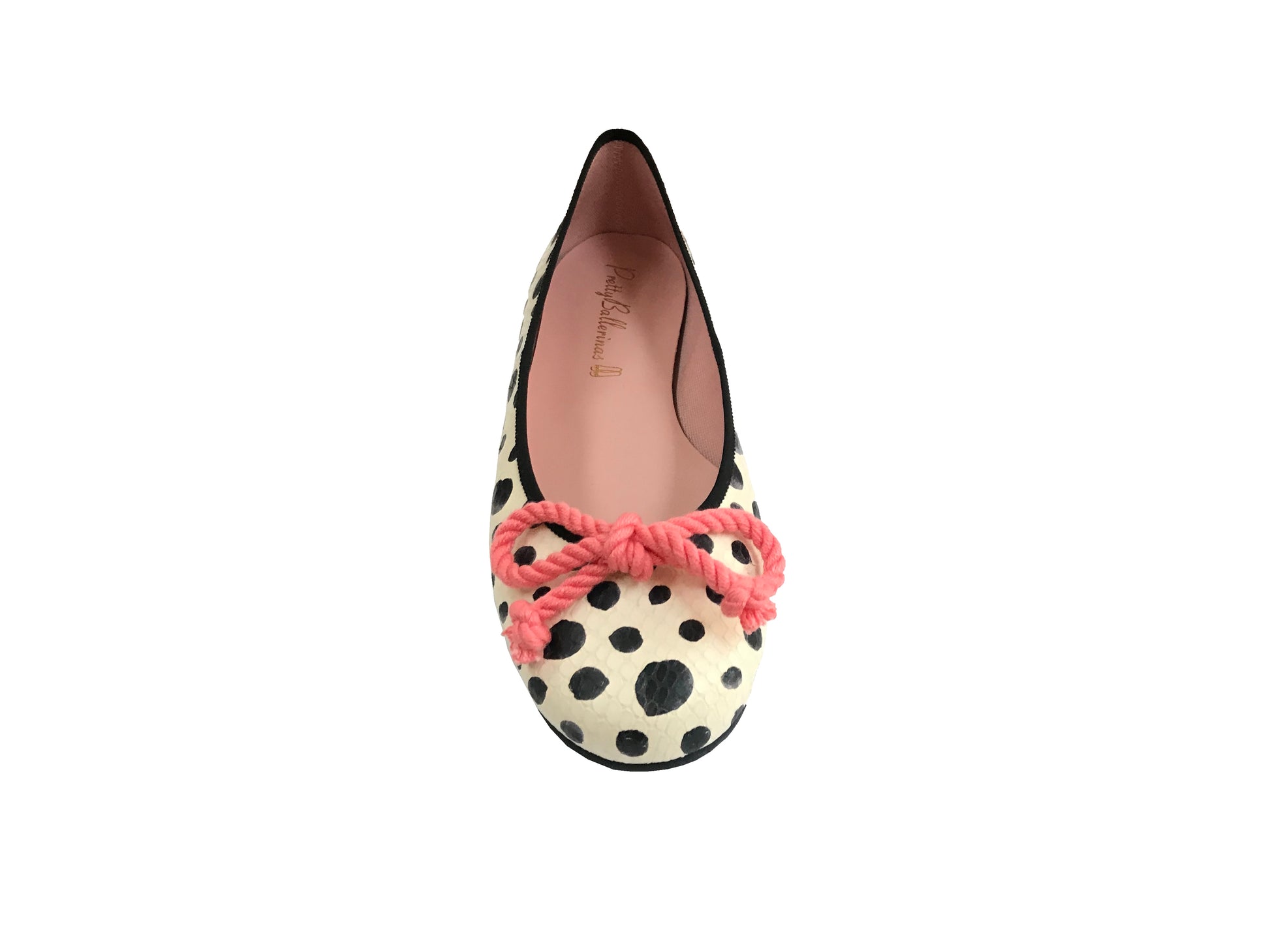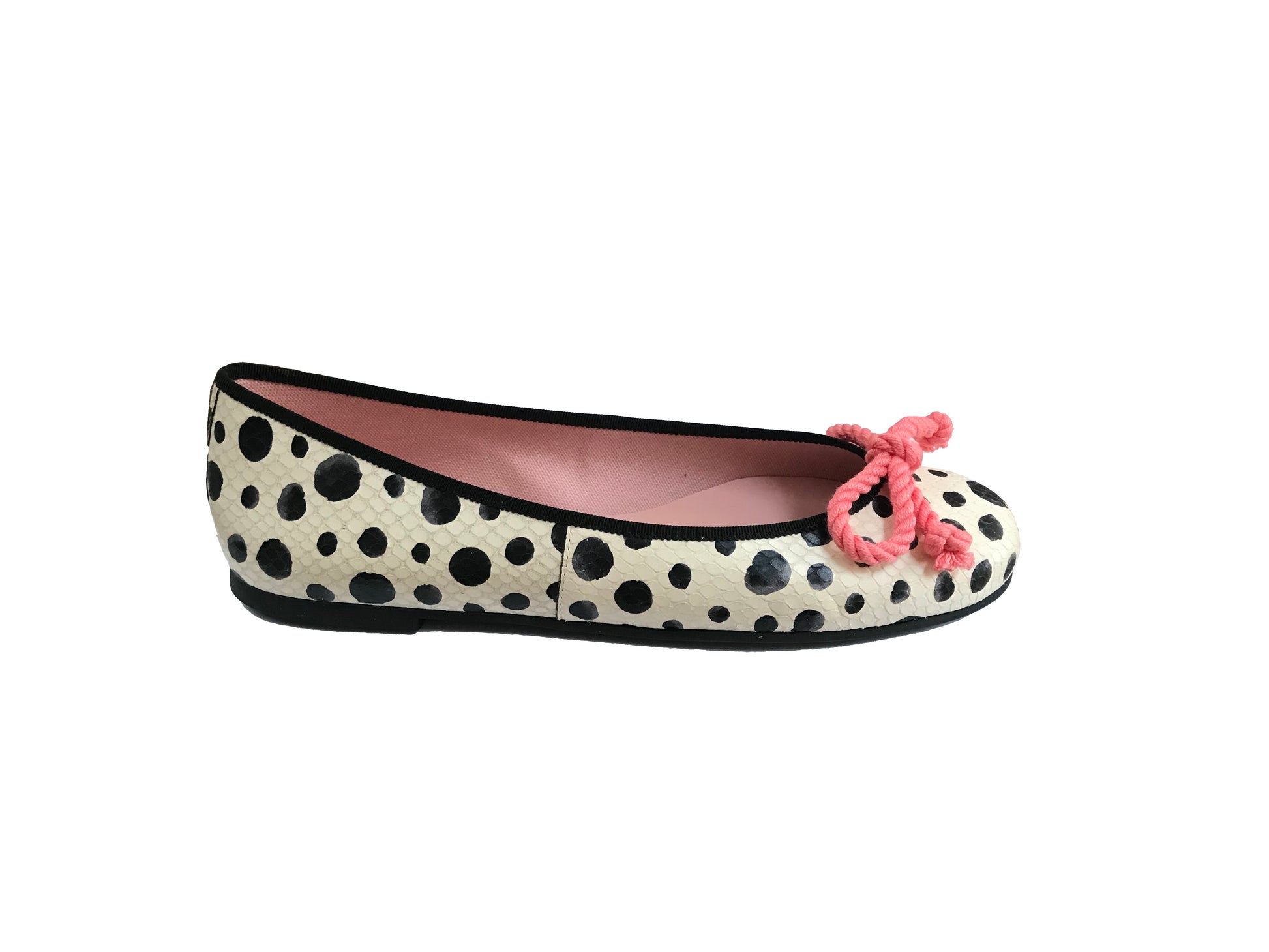 A rounded toe ballerina pump in a white and black polka dotted leather with a black trim and a fixed pink bow.