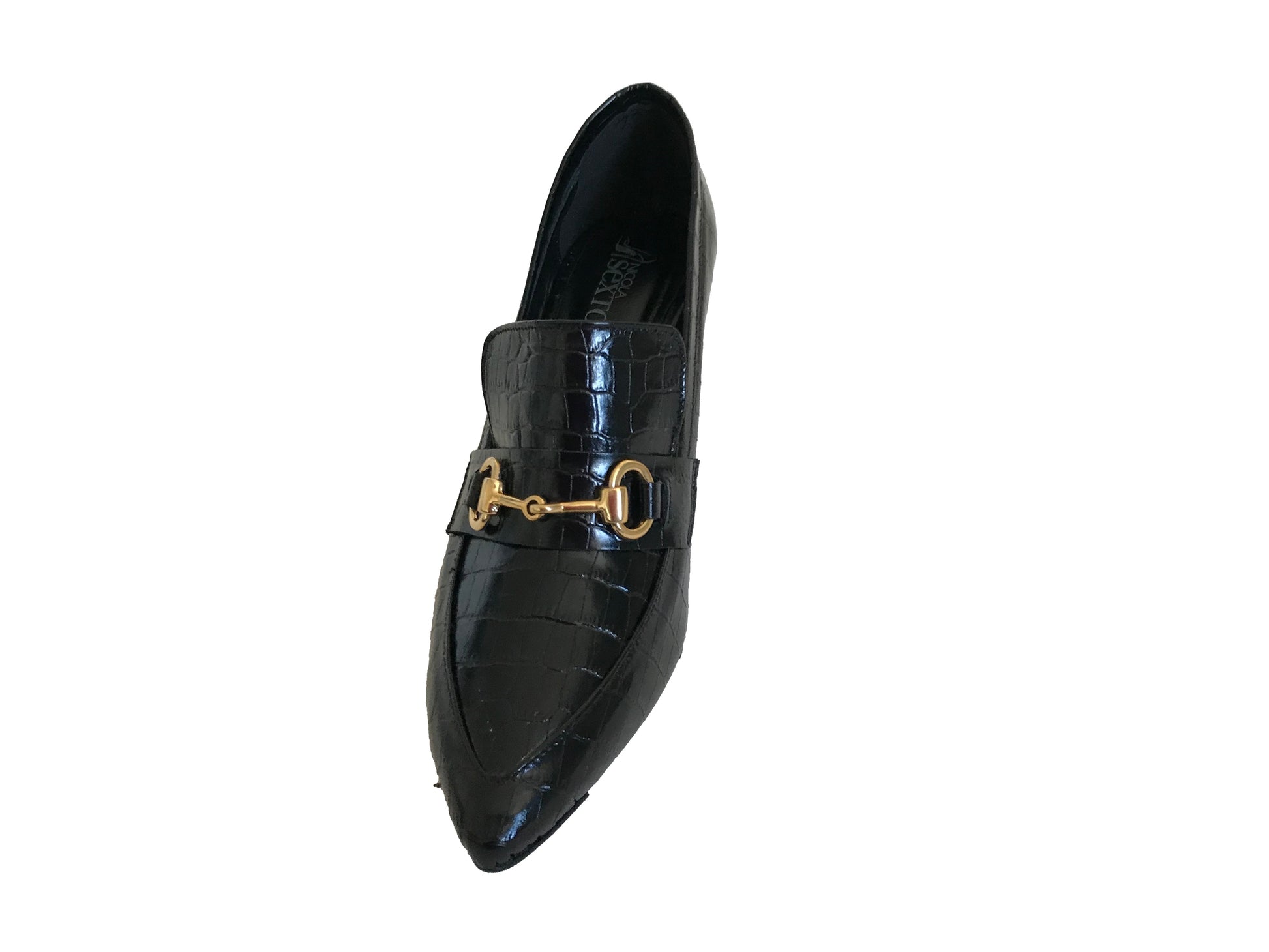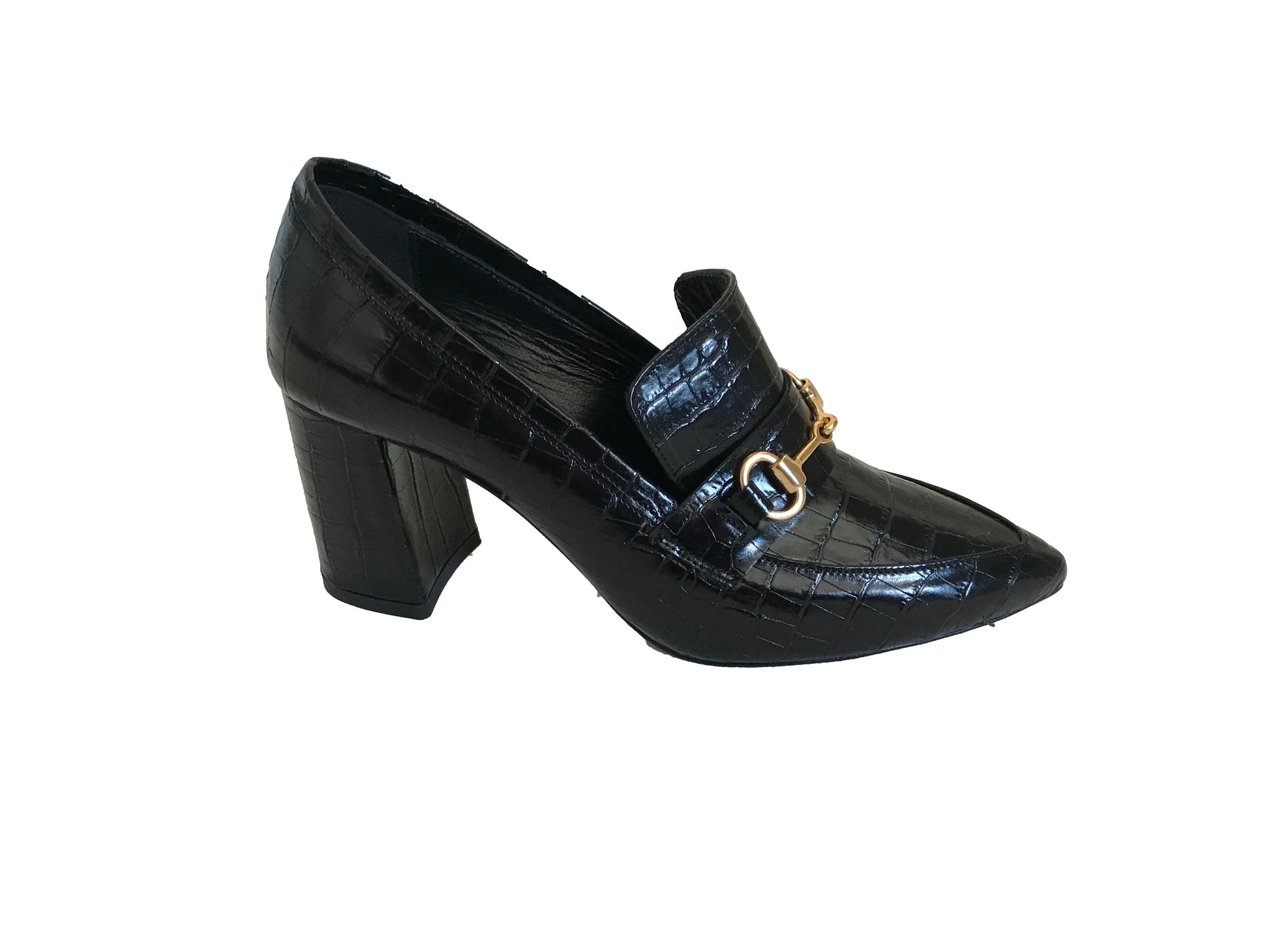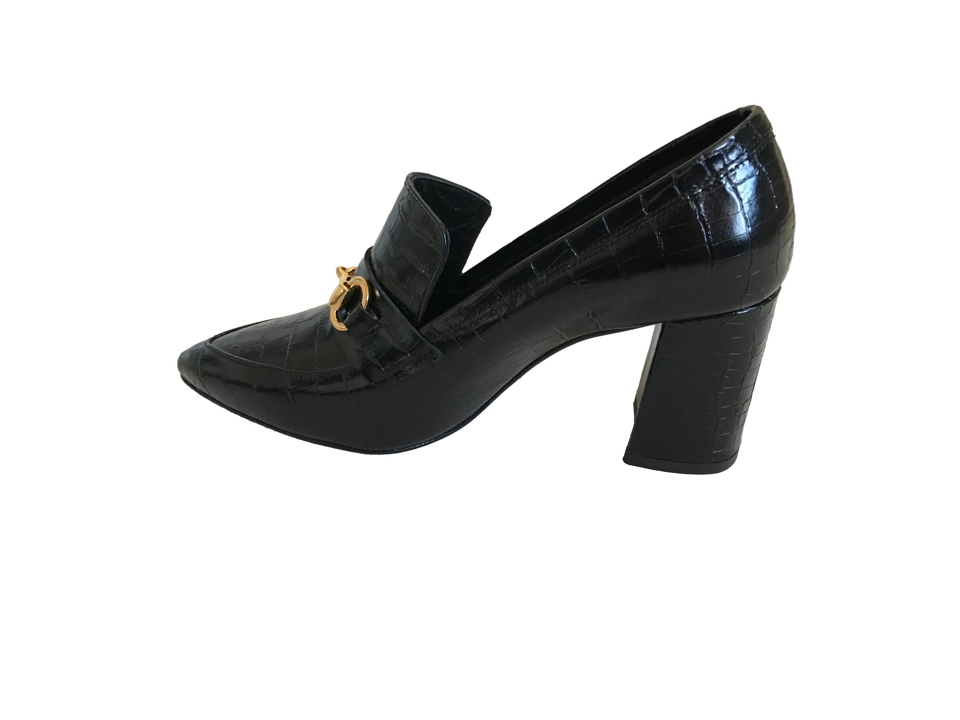 Black Leather Croc effect slip on shoe. Pointed toe with gold bar detail across front. 3 inch block heel.