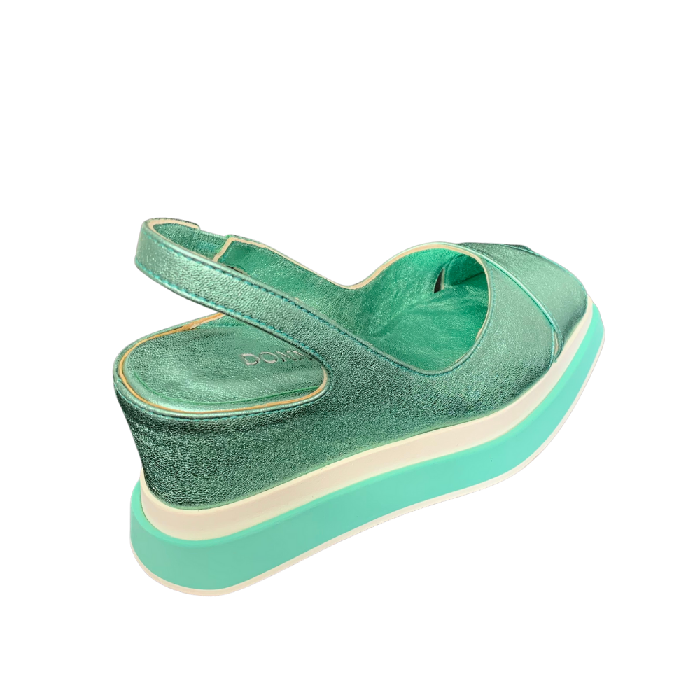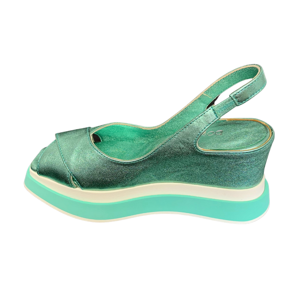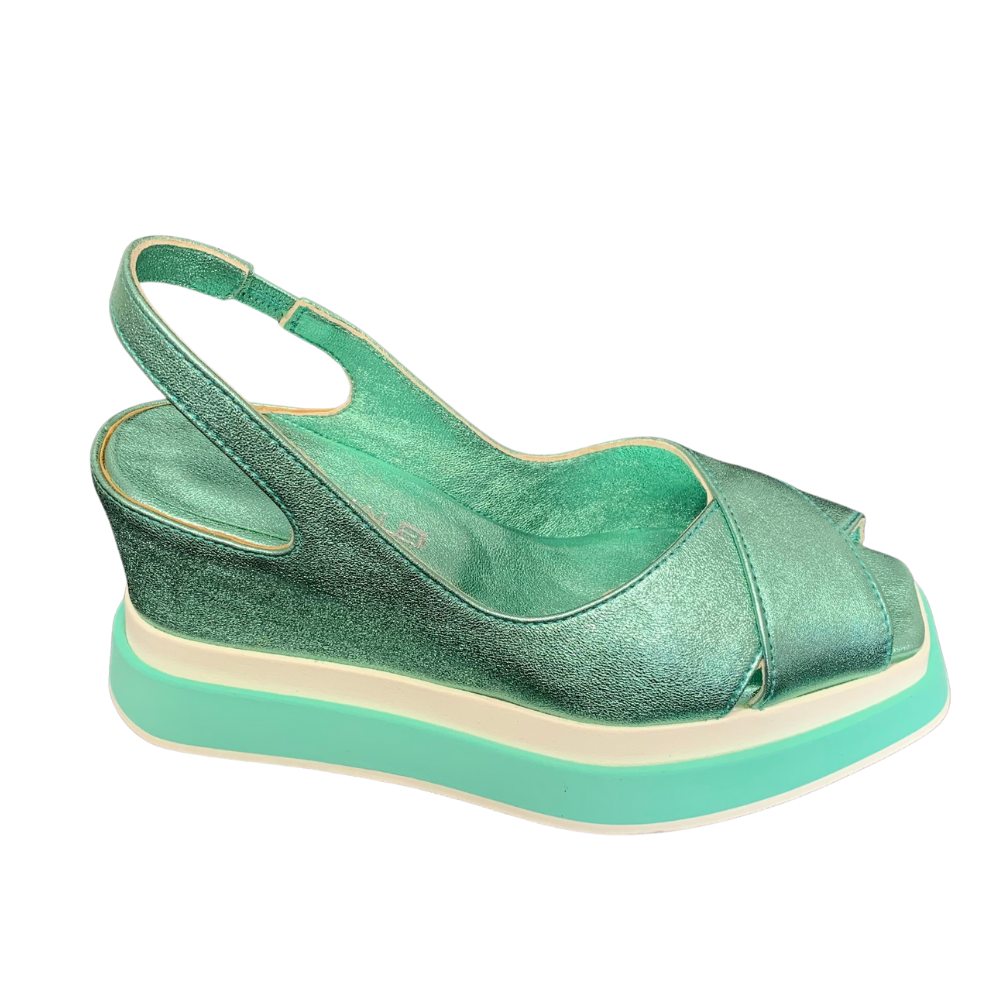 Aqua metallic leather shoe with peep toe and sling back with elasticated panel for comfort. Wedge heel and two tone platform sole.