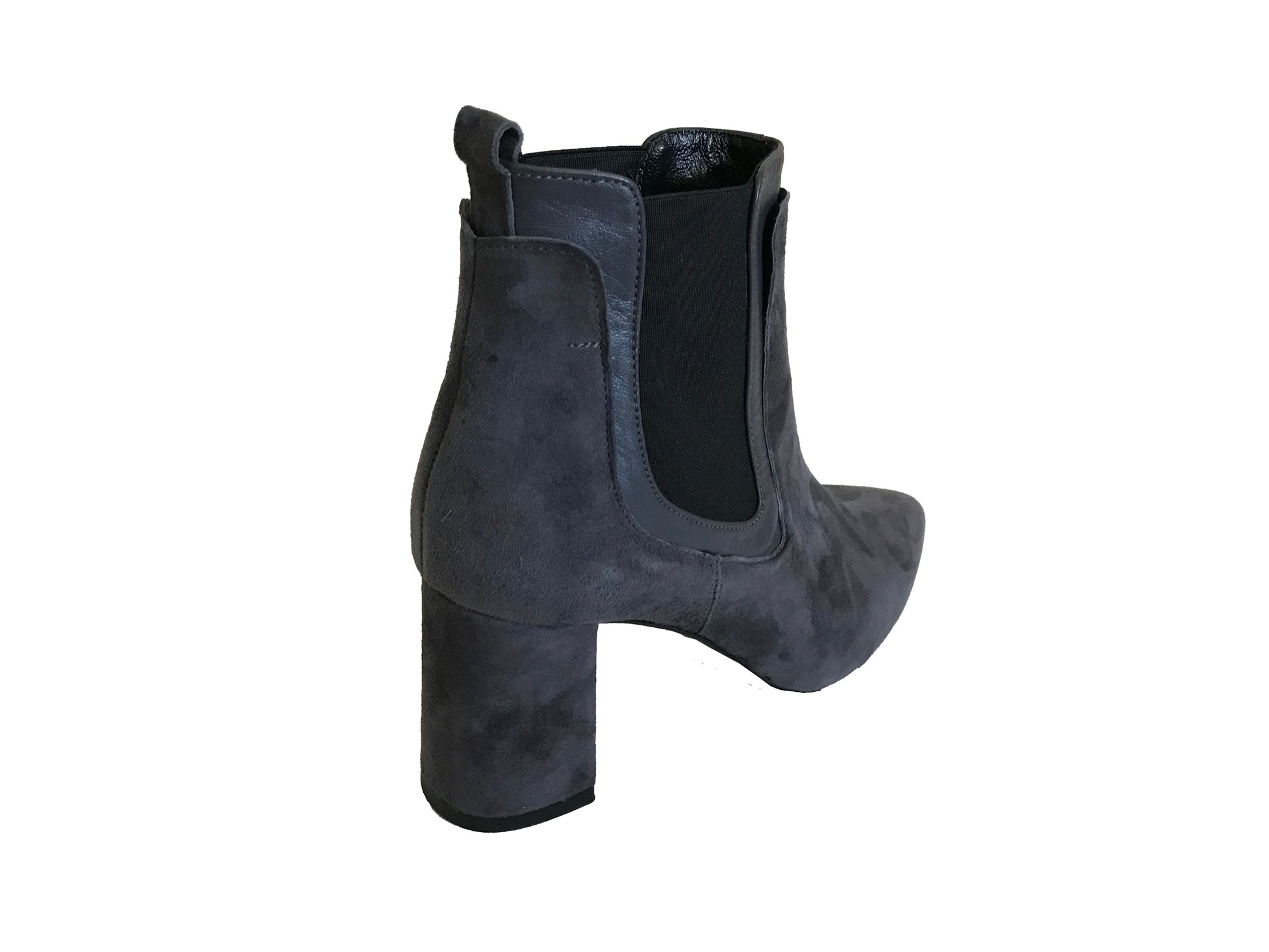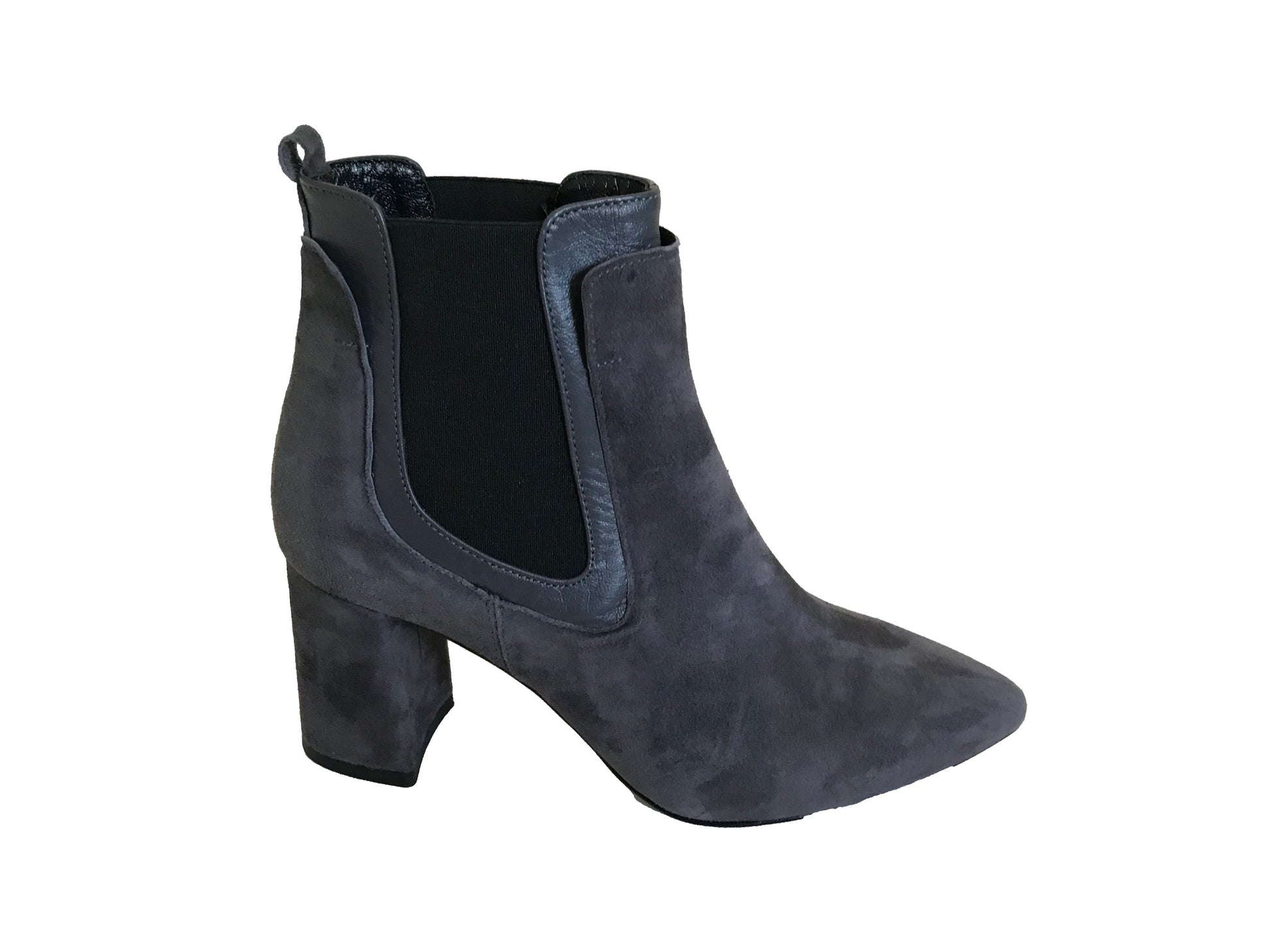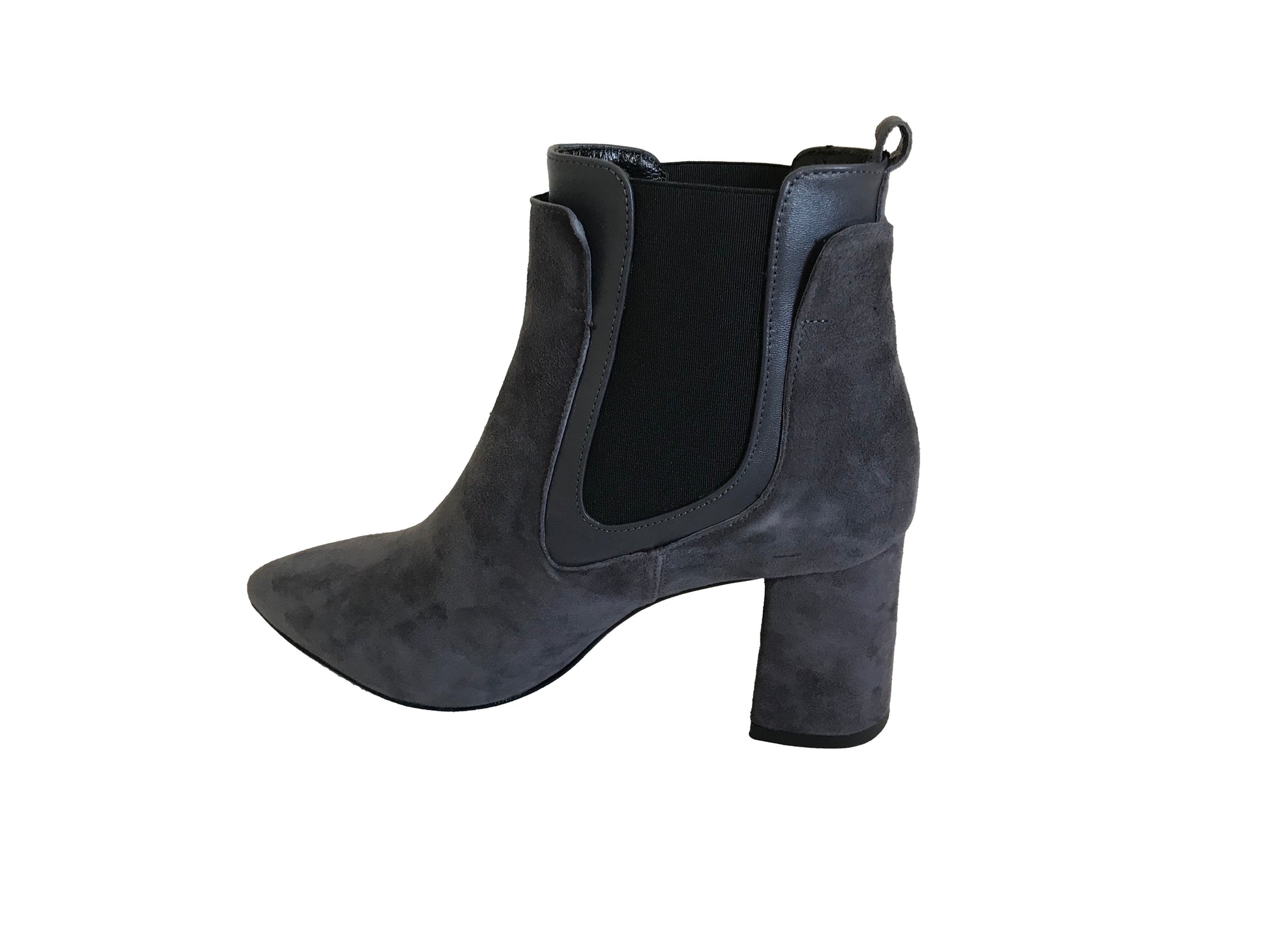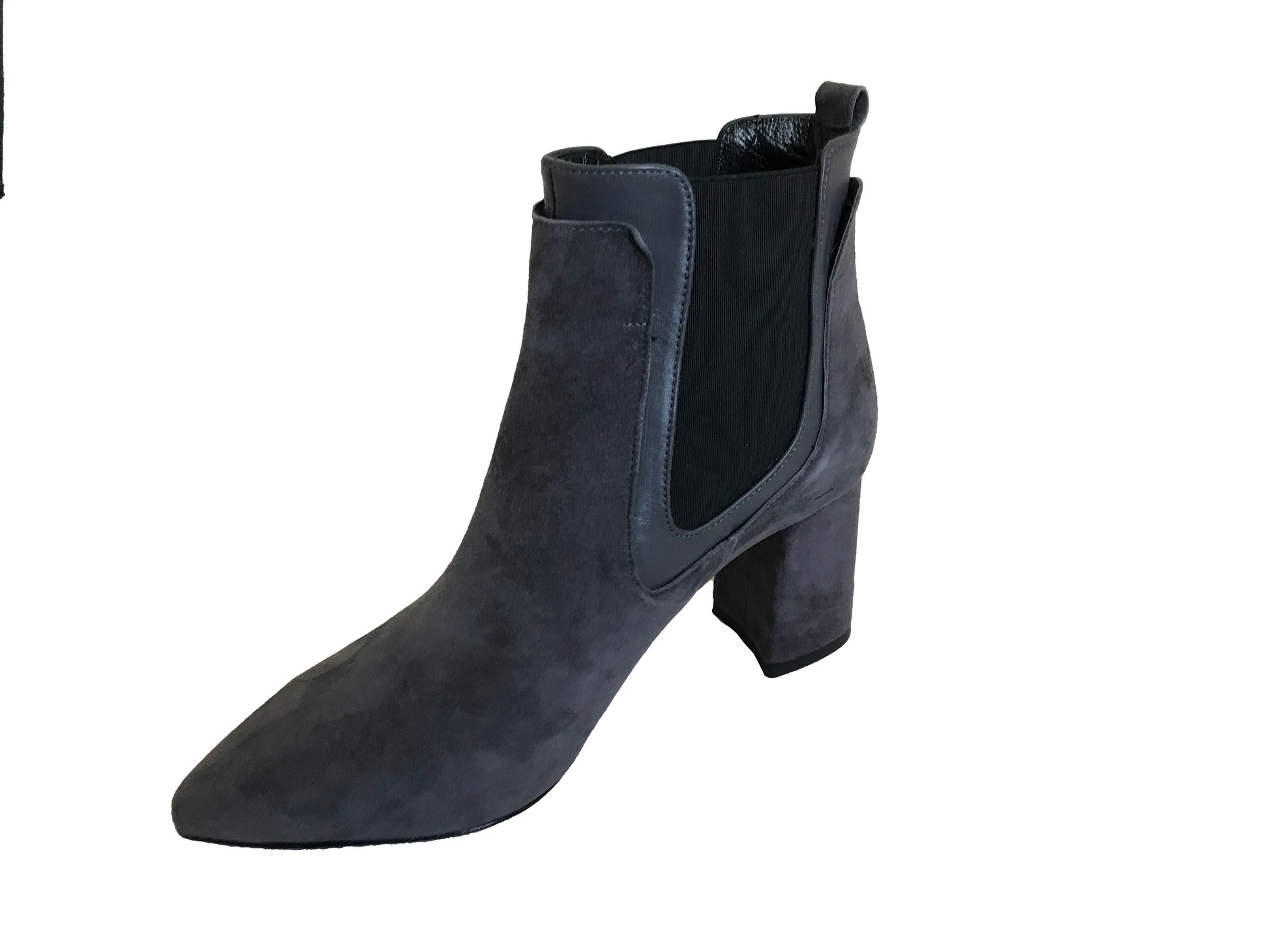 Grey suede and leather slip on ankle boot with elasticated panels to sides. Approx 3 inch suede block heel